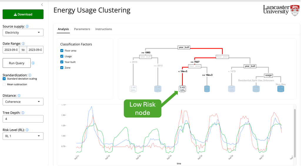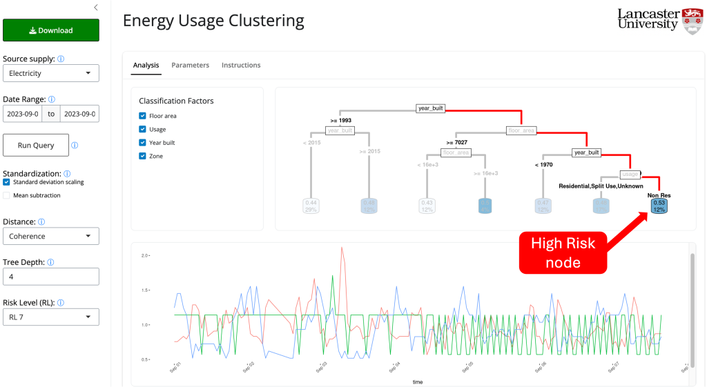 To understand the associations in usage patterns across buildings and support the development of energy management strategies. The Net0i team developed an Energy Clustering Dashboard to identify abnormal behaviours in energy usage by comparing the energy usage patterns across buildings. The dashboard assigns an anomaly score to each building, indicating the potential of the consumption pattern being anomalous. Then, to understand the factors driving the building consumption, a regression tree clusters the buildings based on the anomaly score and other known characteristics.