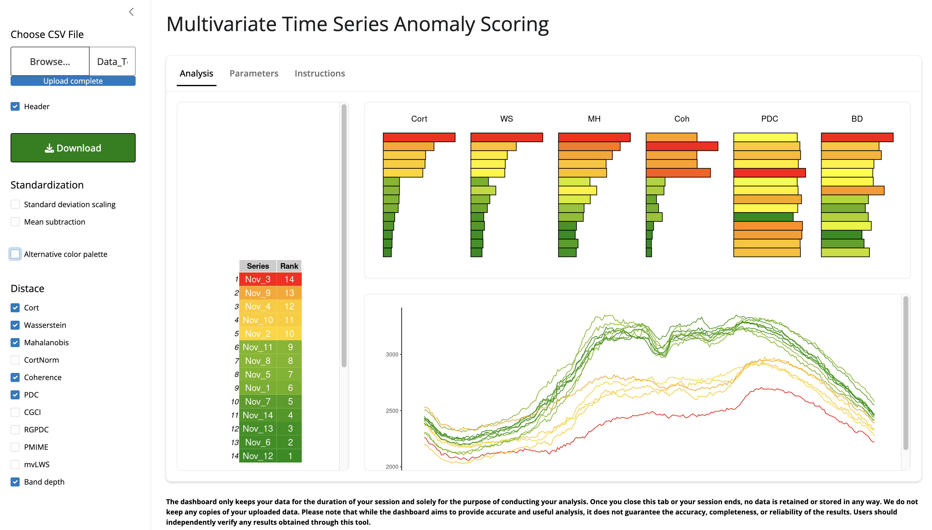 This dashboard allows users to upload, explore visually, and rank multivariate time series data by assigning anomaly scores using a nearest-neighbor approach. The anomaly scores are computed using the R package AnomalyScore . Different options to compute the scores are provided to ensure a comprehensive analysis of the data.